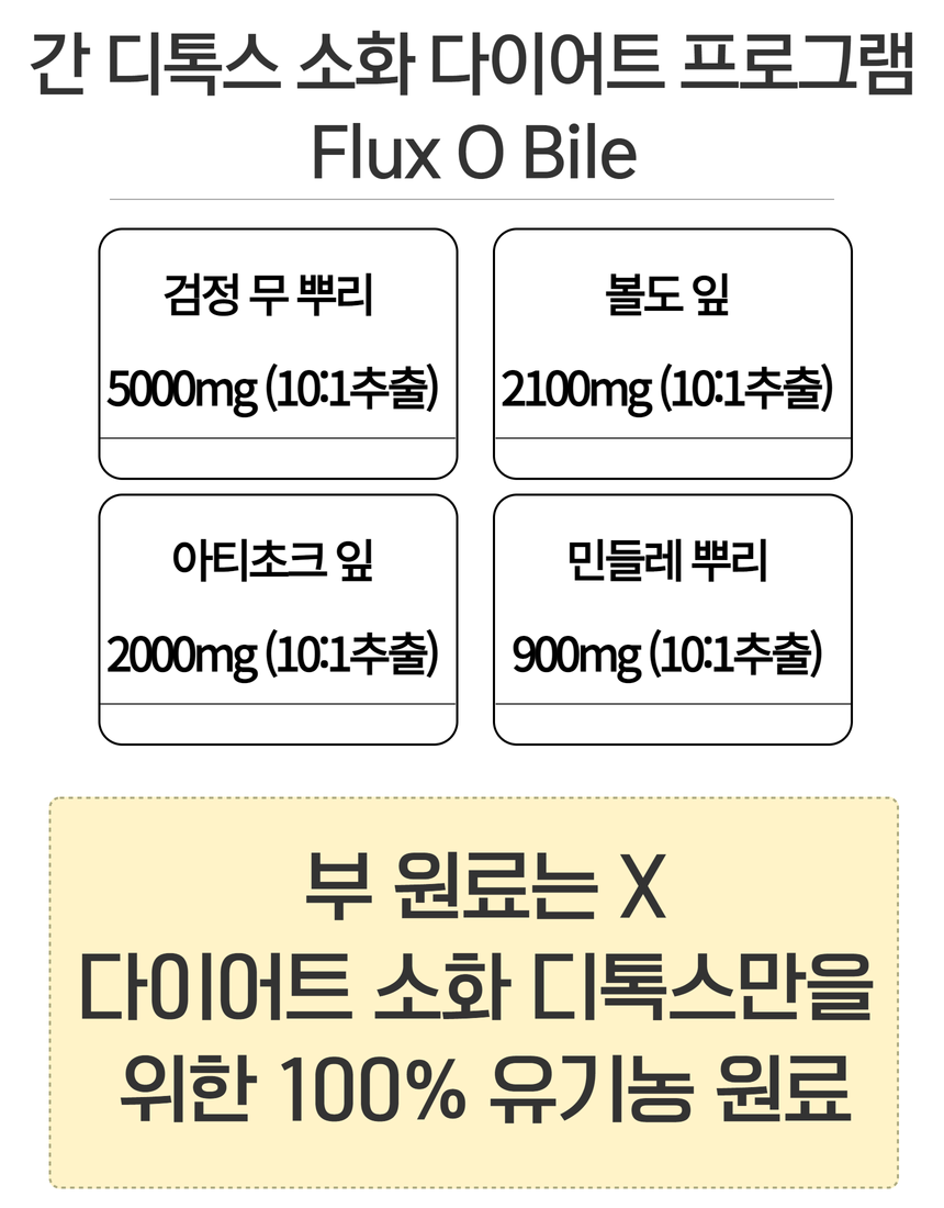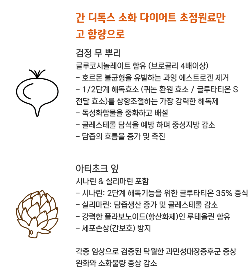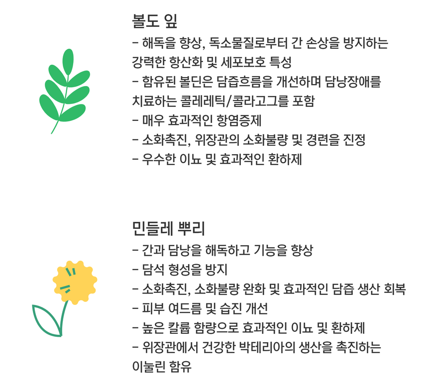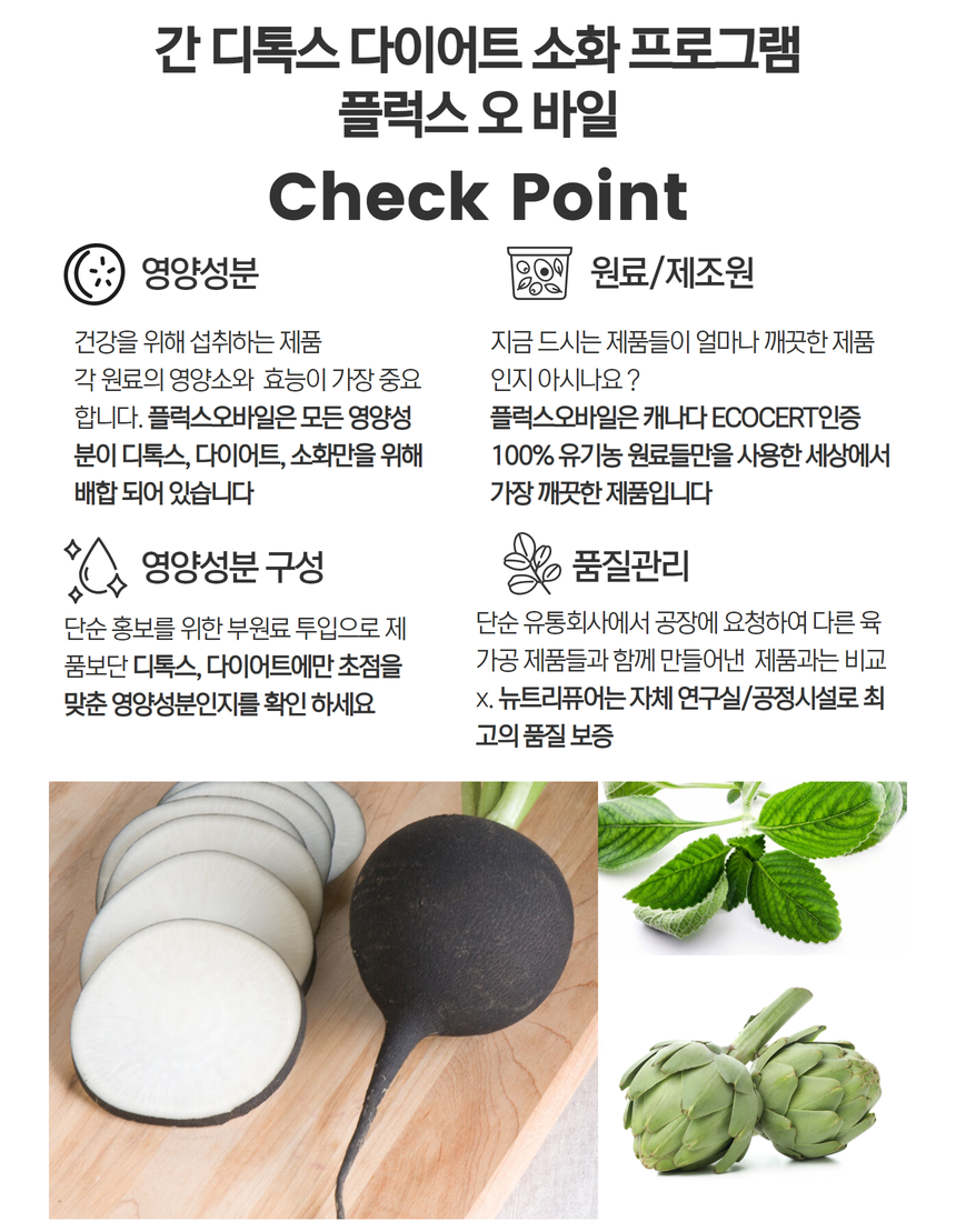 •100% 유기농원료의 간 세척과 담즙기능 자극으로 소화기능 향상